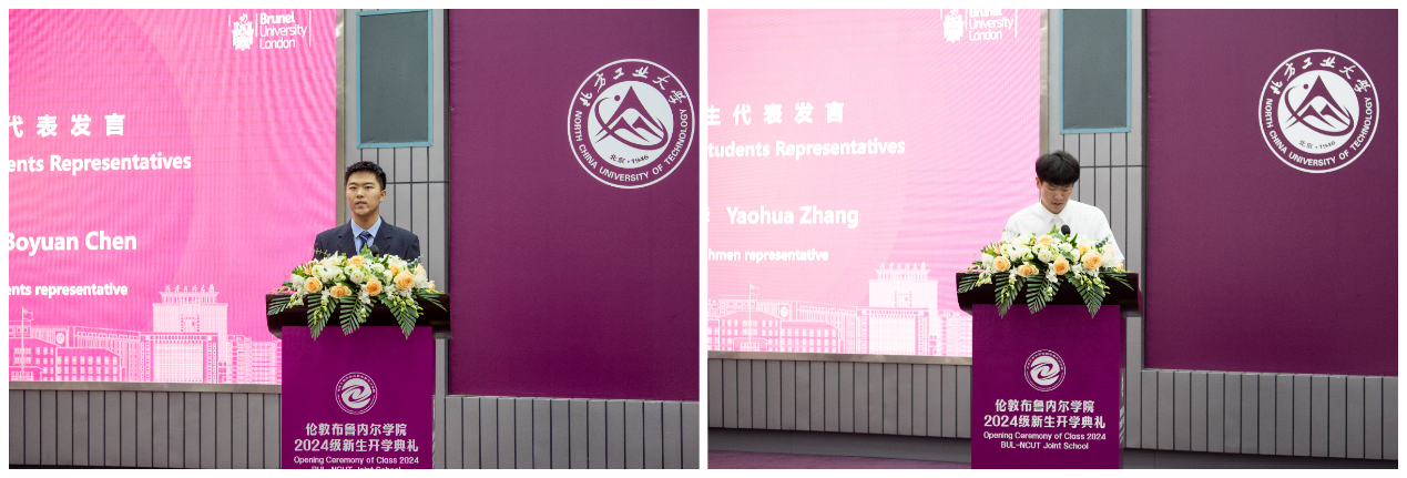 高年级员工代表、土木(中外合办)21-1班的陈柏元同学号召大家要珍惜来之不易的国际化环境,在最美好的时光里成就更灿烂的自己。新生代表、大数据(中外合办)24-3班的张耀华同学倡议大家将校训“敦品励学,才德并懋”作为立身立学的准则,内化于心、外化于行,成长为有用之才。